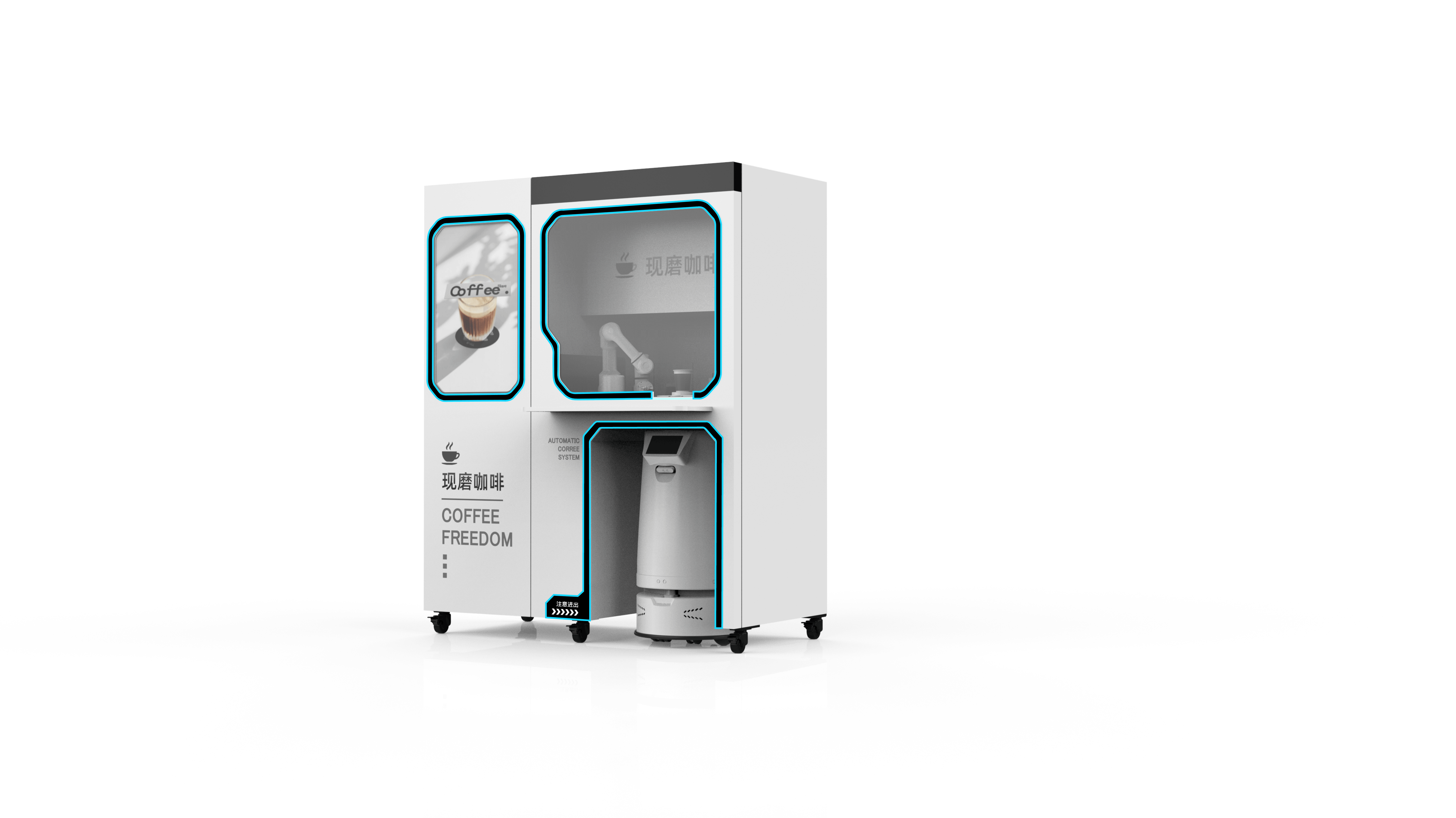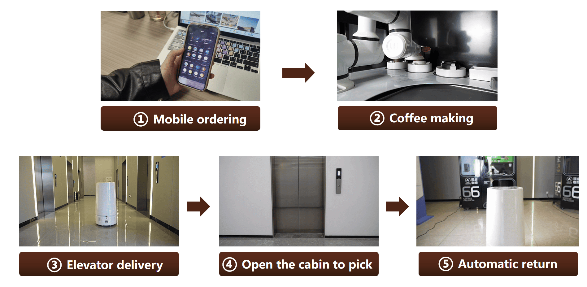 “除了工业领域,我们同样关注生活服务场景的需求,用技术让日常服务更智能、更贴心。” IMANE话锋一转,将焦点转向生活服务类产品。智能咖啡机器人是其中的明星产品,IMANE详细拆解了其 “智送一体” 的创新流程:“用户通过手机完成移动下单后,机器人会自动完成取杯、打奶泡、萃取等咖啡制作环节,随后由配套的移动无人车搭载咖啡,自主规划路线并通过电梯配送至指定地点,用户扫码即可打开舱门取餐,完成服务后机器人自动返回基站充电,整个过程无需人工干预。”